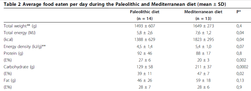 Above, I’ve provided a screen shot of the daily intakes of CHO between the two diet-groups (Paleo is the left column, Mediterranean is the right column). As you can see, the Paleo group consumed about 97g (or 42%) fewer carbohydrates than the Mediterranean group. On the other hand, the protein content between the groups did not differ by any significant degree (90g vs. 89g), nor did the fat content (42g vs. 50g). However, the failure to account for equal macronutrition between the two groups makes it hard to determine the actual impact of the Paleo food choices rather than just having an ideal ratio of protein to CHO. In fact, a substantial amount of research done by Donald Layman, at the University of Illinois at Urbana-Champaign, shows that having a higher protein to CHO (PRO:CHO) ratio helps to improve glucose homeostasis in individuals, especially during weight loss [2-6]. What’s more, Layman’s subjects were definitely not eating a Paleolithic diet!