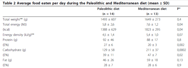 You will also notice the 82g difference in CHO intake between the two groups. Taken together, this drastically increases the PRO:CHO ratio, essentially making the Paleo diet nothing more than a low-CHO diet. To quote the authors themselves;