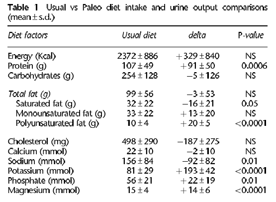 In the next study, Frassetto et al. saw that compared to usual dietary habits, a Paleolithic-style diet improved glucose tolerance, insulin sensitivity, blood pressure, and lipid profiles, independent of weight loss, in nine sedentary, overweight subjects [7]. Again, the results are not surprising given the poor, prior dietary habits of the participants. Below, the screenshot clearly shows that the usual intakes of subjects were higher in saturated fats, cholesterol, and sodium, while being lower in mono- and polyunsaturated fats, protein, and some other micronutrients.